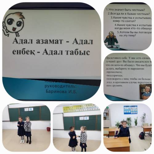 4 ноября в рамках программы "Біртұтас тәрбие" во всех классах проведён классный час на тему "Адал азамат-Адал еңбек - Адал табыс". Цель классного час: сформировать в сознании детей понятие "честность"; расширить знания школьников о честных поступках; воспитывать доброжелательность.